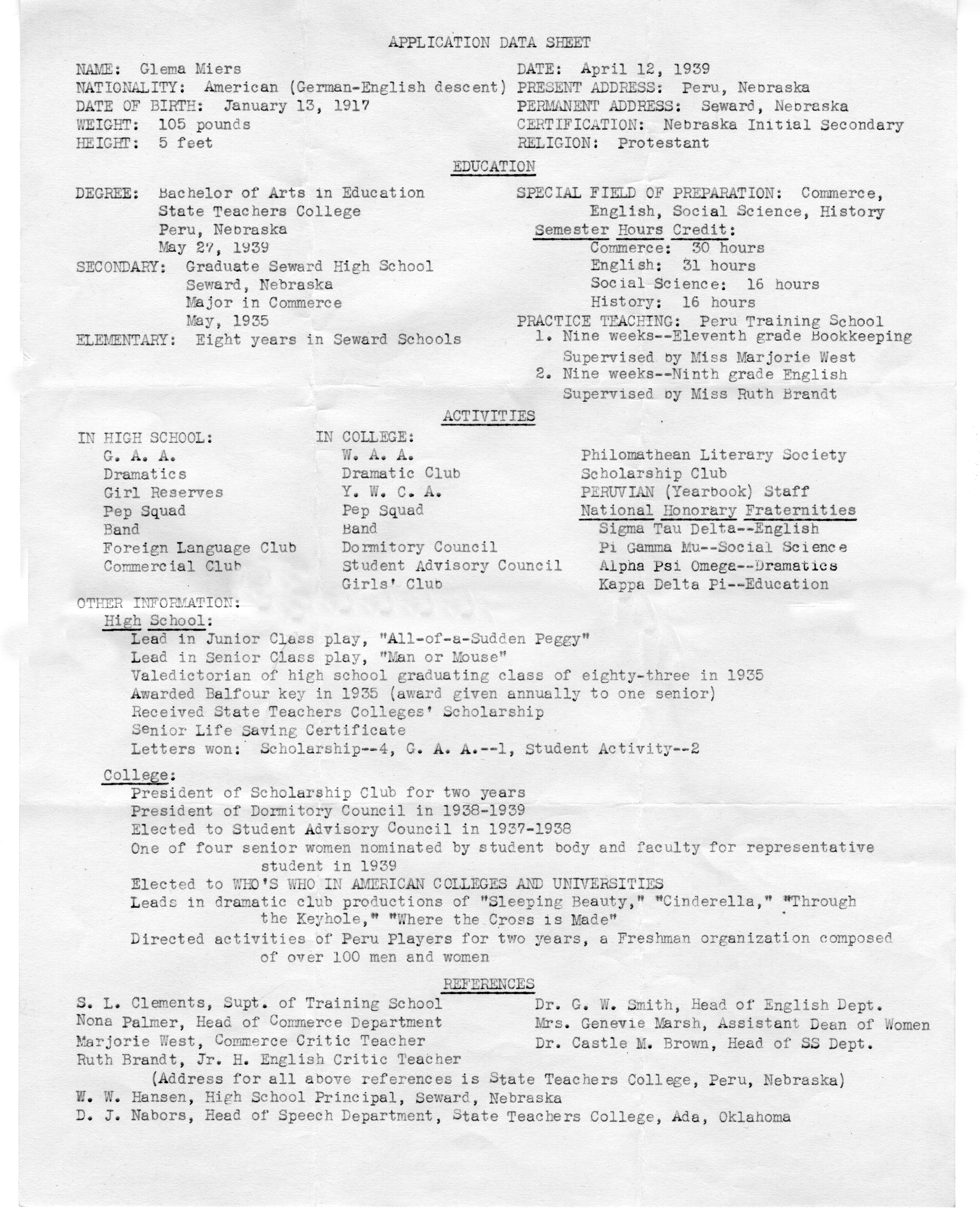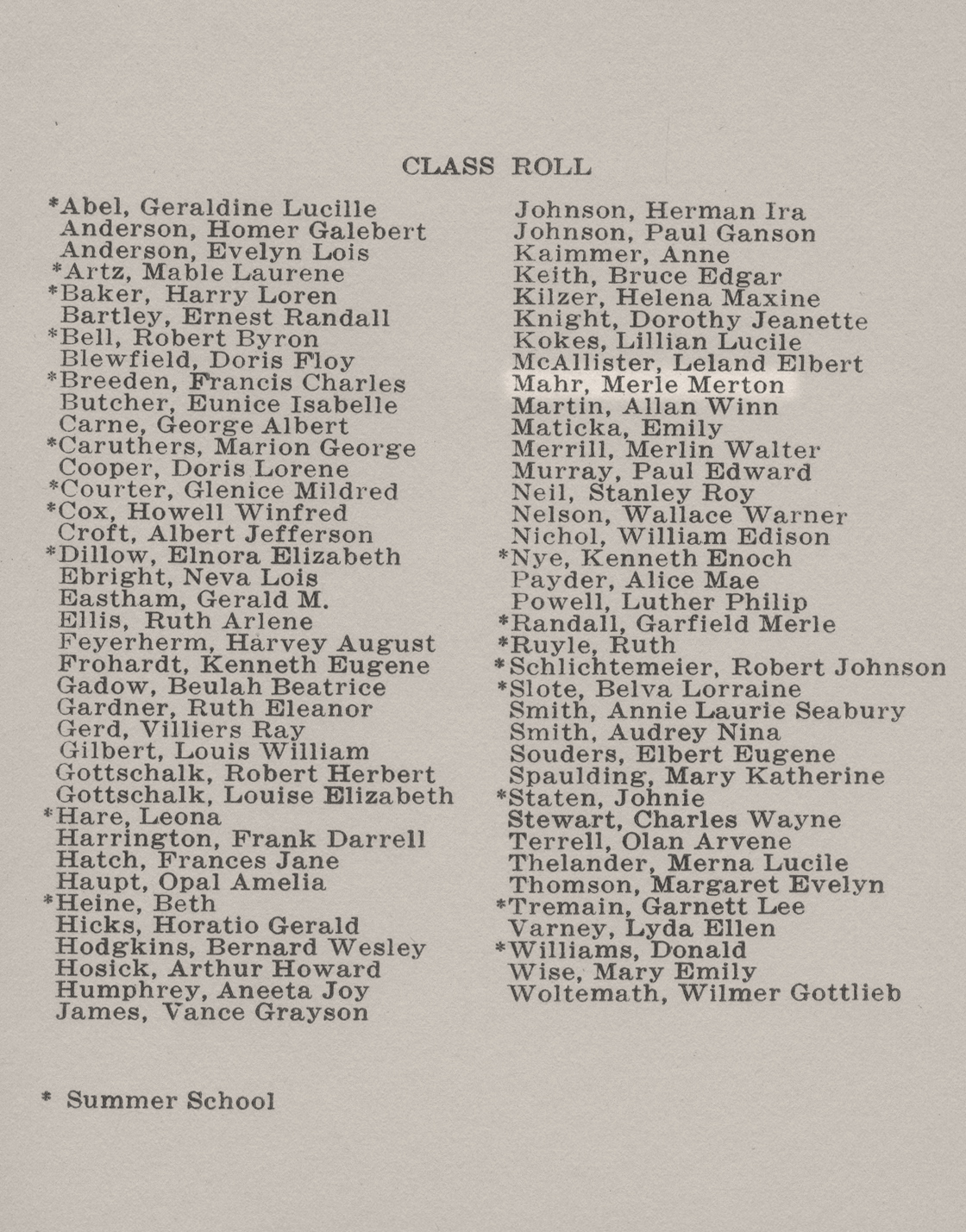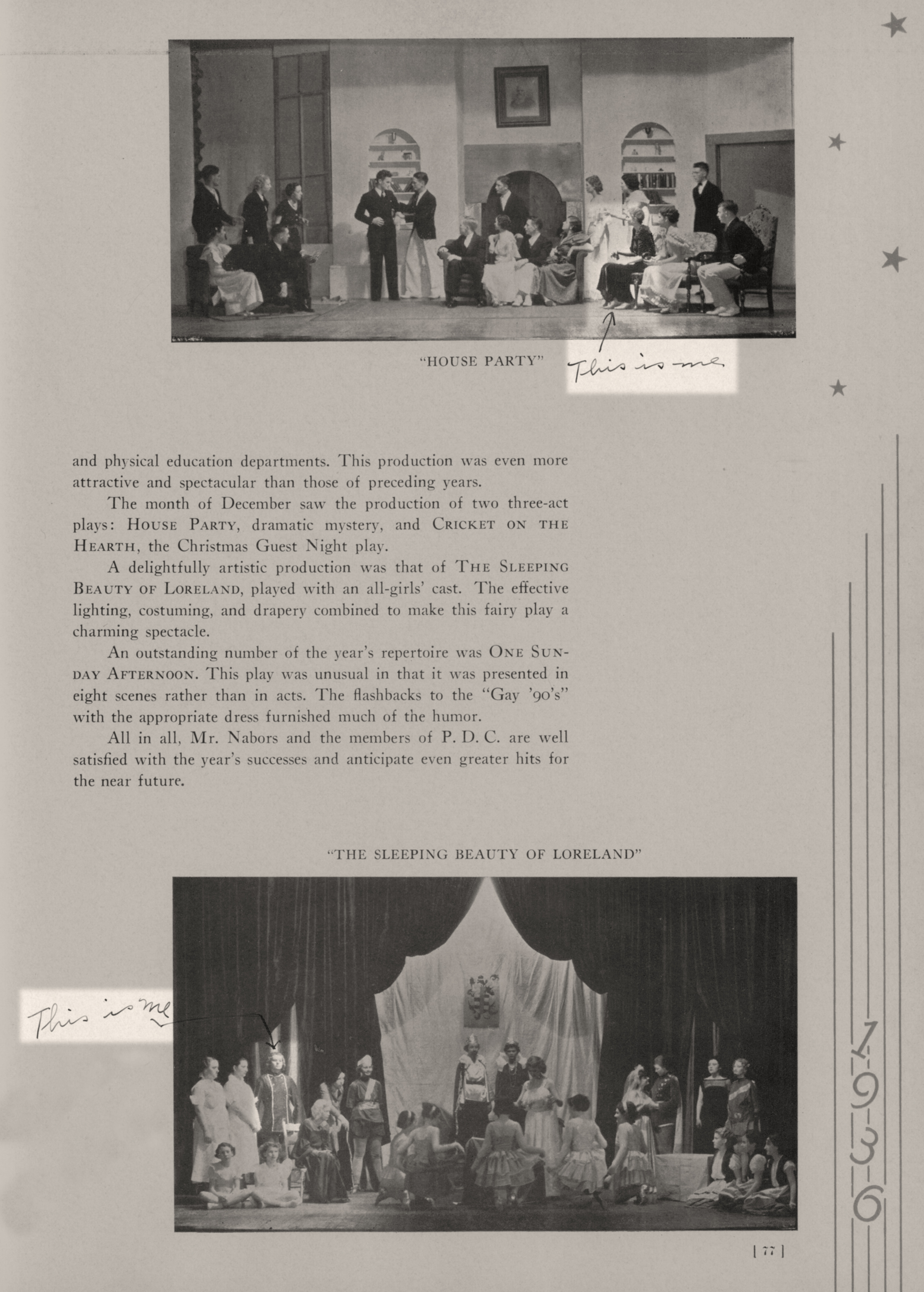 Glema was a member of the 1936 Peru Dramatic Club, appearing in two productions: “House Party” (dramatic mystery) and “The Sleeping Beauty of Loreland” (all-girls’ cast).