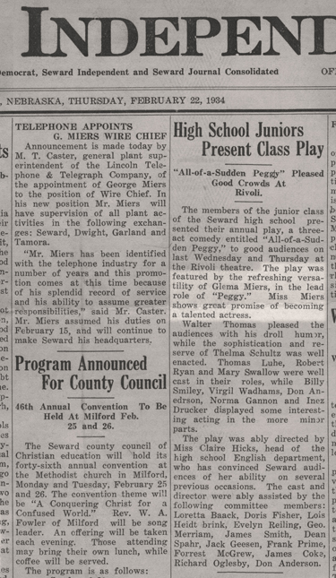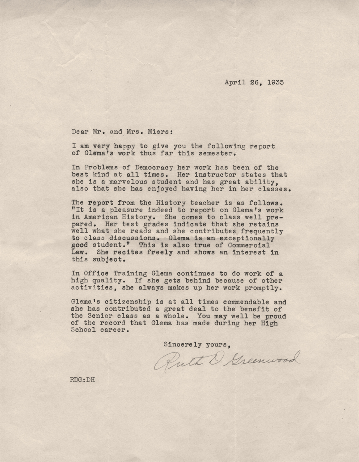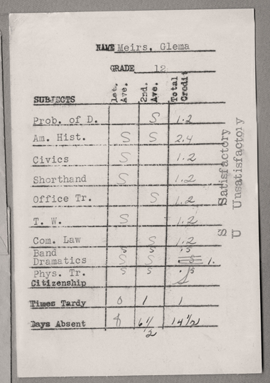 “Miss Miers shows great promise of becoming a talented actress.” — a quote from Glema’s hometown newspaper in reference to her starring role in the Junior Class Play.