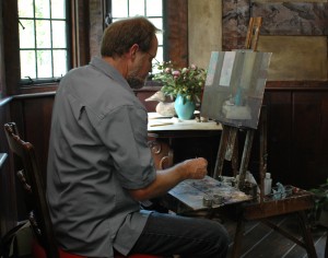Chris Still works on a very special still life in the “Monk’s Corner” of Darling’s Des Moines home.